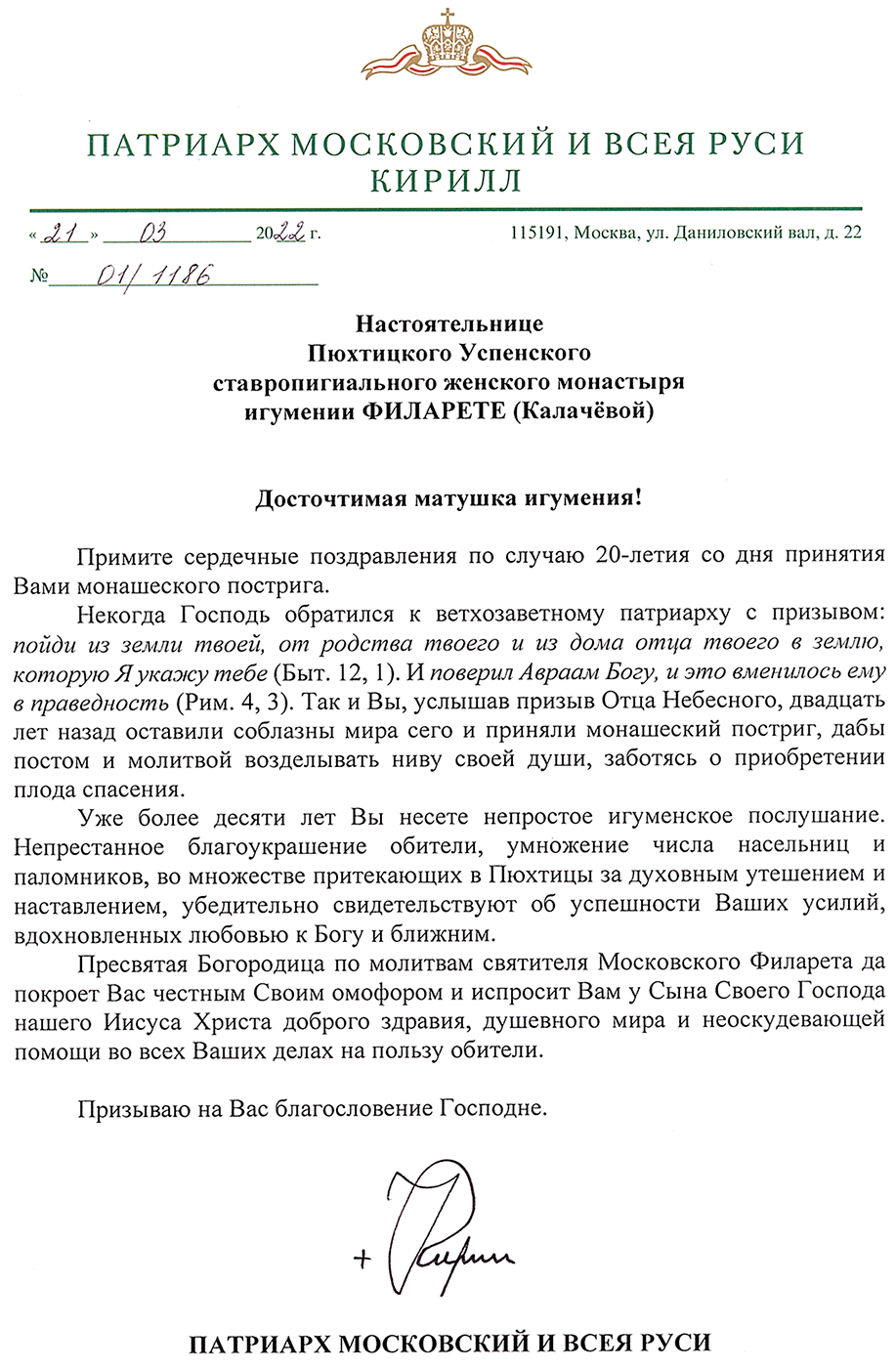 Pühtitsa Jumalaema Uinumise Stavropigiaalse Nunnakloostri ülemale, iguumenja Filaretale (Kalatšova)