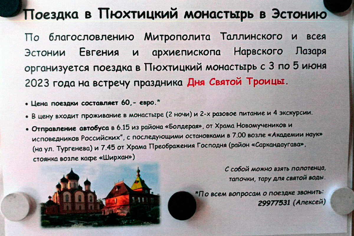 Обращаем ваше внимание на некоего Алексея (тел. +371 29977531), который собирает паломнические группы в Пюхтицкий монастырь «по благословению митрополита таллинского Евгения и архиепископа нарвского Лазаря».