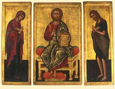 (греч. «моление») – композиция из трех икон – в центре икона Иисуса Христа, восседающего на престоле славы, с обращенными к Нему Пресвятой Богородицей по правую от Него руку и Иоанном Предтечей по левую. |